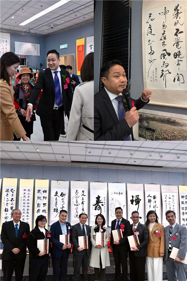 开幕仪式由原香港文汇报记者,金牌主持人熊丽珺女士主持。中联办新界工作部一级调研员李成德、福建省政协委员林祥华、候任立法会议员郭芙蓉等近十余名嘉宾莅临现场。仪式上,主持人以诗意的语言阐释展览主题,将“古云墨韵”比作历史智慧与艺术生命的完美融合。在致辞环节中,郭芙蓉议员充分肯定了此次展览对促进香港文化发展的积极作用。赵汝彬院长回顾了自己数十年的艺术历程,表达了作为文化传承者的责任担当。郑云光院长则从学术角度深化了展览主题的内涵,强调“书画同源”在当代艺术实践中的重要意义。