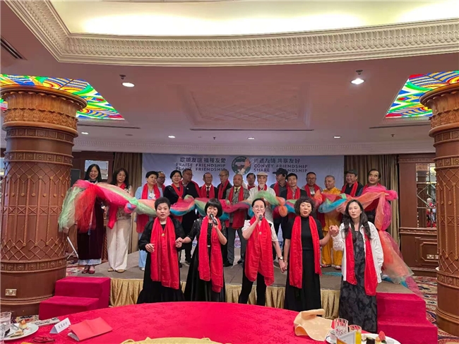 活动最后的合唱环节,中方代表王新萍、张百音、王素娟、杜鸿带来《朋友歌》与《友谊地久天长》两首经典曲目,把会场气氛推向高潮,歌曲大气、温暖而治愈。